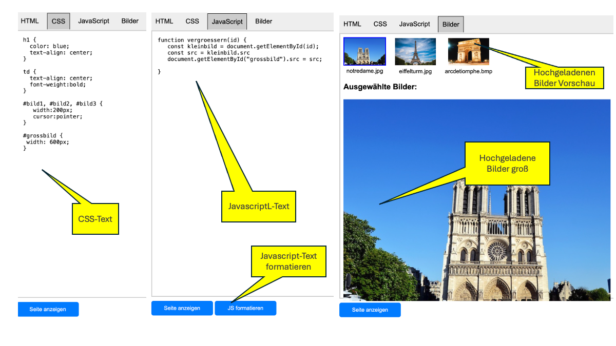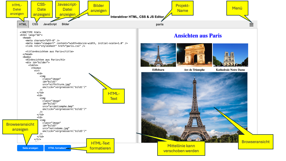 Der interaktive HTML, CSS und Javascript-Editor ist eine browserbasierte Anwendung mit der interaktiv HTML-Seiten entwickelt und als Vorschau angezeigt werden können. Um bilder in die Website einzubinden müssen diese zuvor hochgeladen werden. Die auf separaten Seiten eingegebenen CSS- und Javascript-Anweisungen werden bei der Vorschau berücksichtigt. Alle eingegebenen Programmtexte können auf den lokalen Rechner heruntergeladen werden.